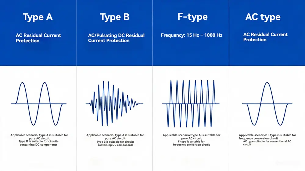 | Jäännösvirran tyyppi | AC tyyppi | Sinimuotoinen AC jäännösvirta; yleisvalaistukseen, pistorasiaan ja resistiivisiin kuormiin. |